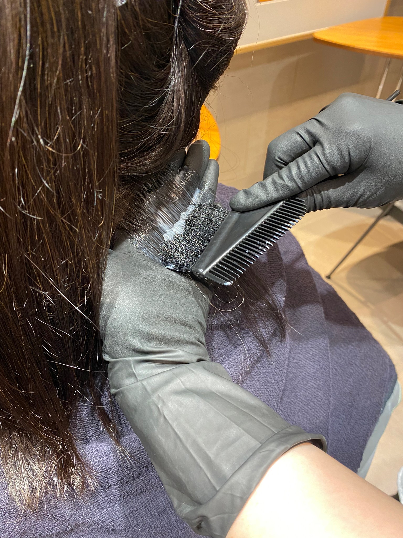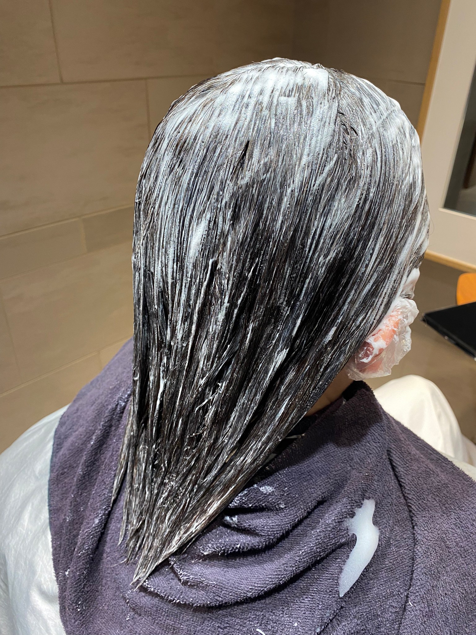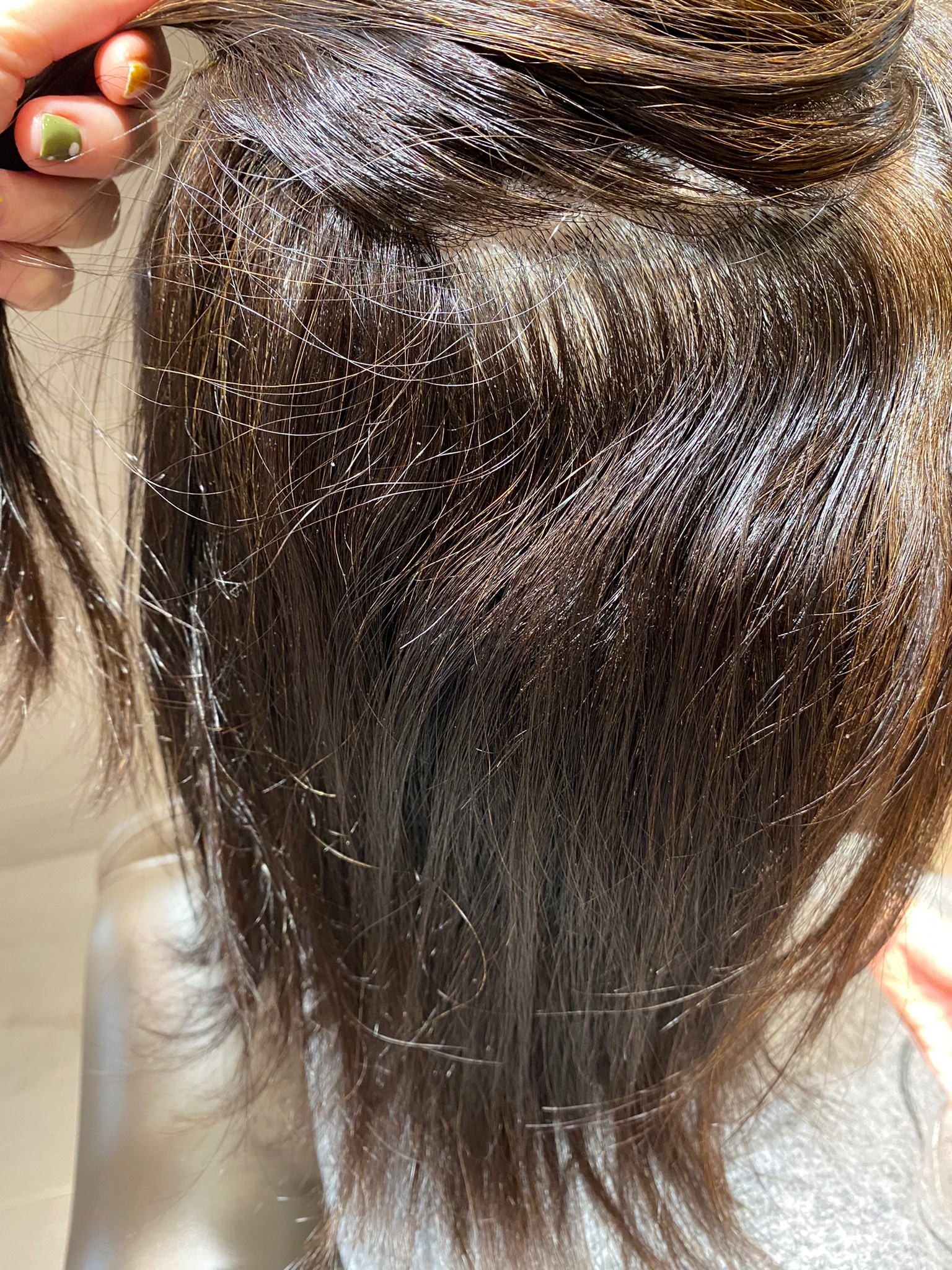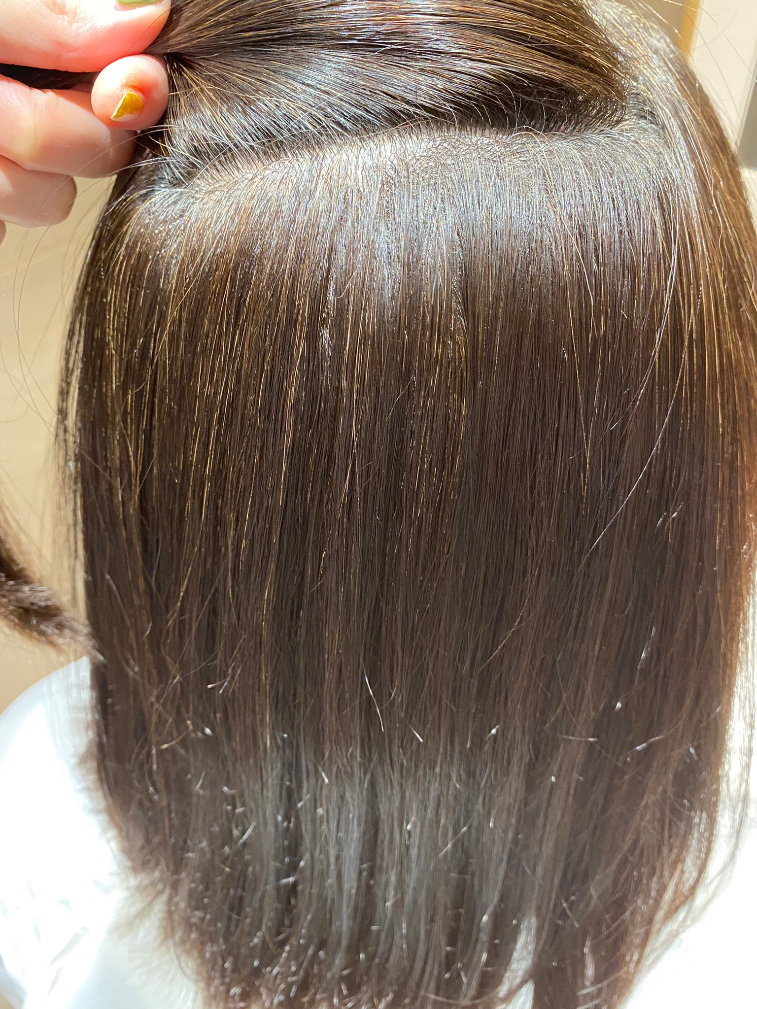 半年前に縮毛矯正を施術し、1.5ヶ月ごとにリタッチ白髪染めを行っているため、毛先はチリつきなどのハイダメージ状態になっています。