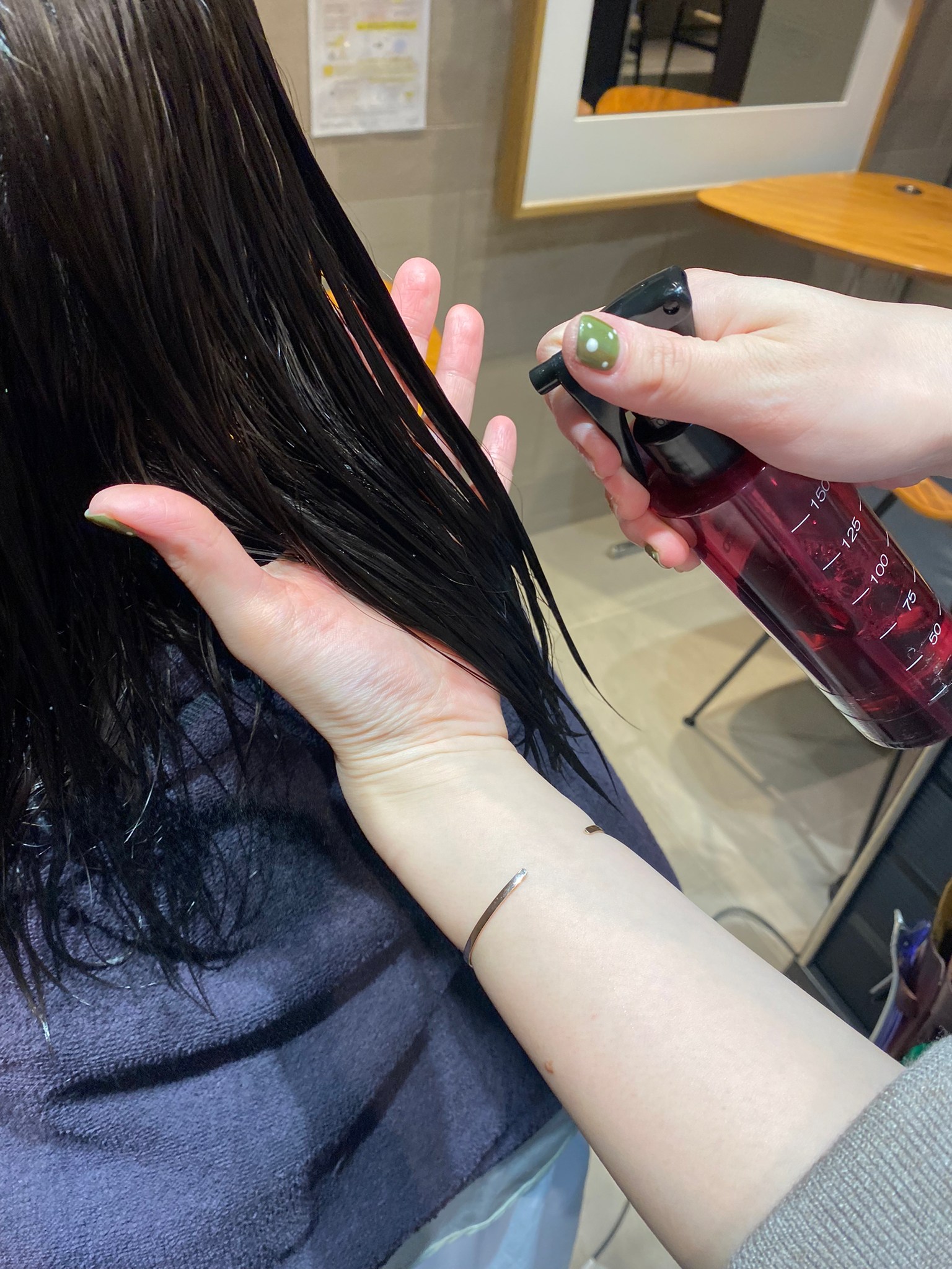 これから行うブローやアイロン作業の前に、髪を熱から守る補修成分と抗酸化効果のあるミネラルを使用することで、ツヤが出ます。