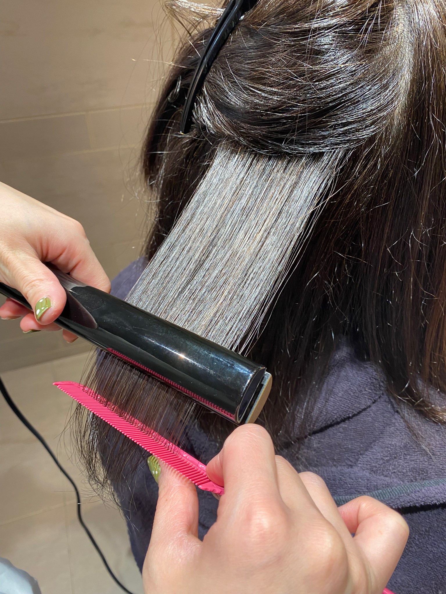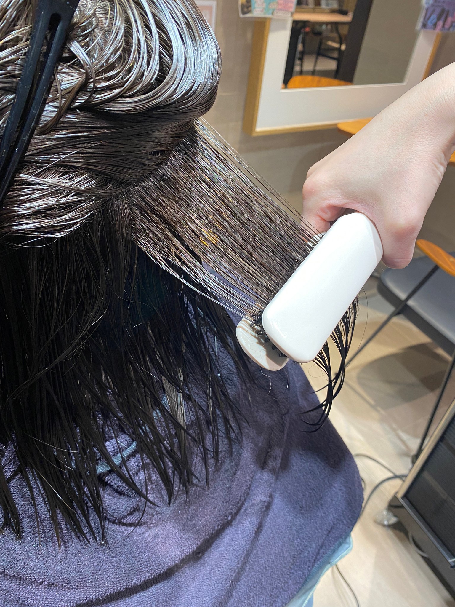 ブラシで捻転(ねじれ)を取った後は、波状や縮毛を熱で真っ直ぐに整えるため、丁寧かつ優しく施術していきます。この際もヘアビューロンを使用。180度の高温でも、遠赤外線の力により髪の水分量を20%増加させます。